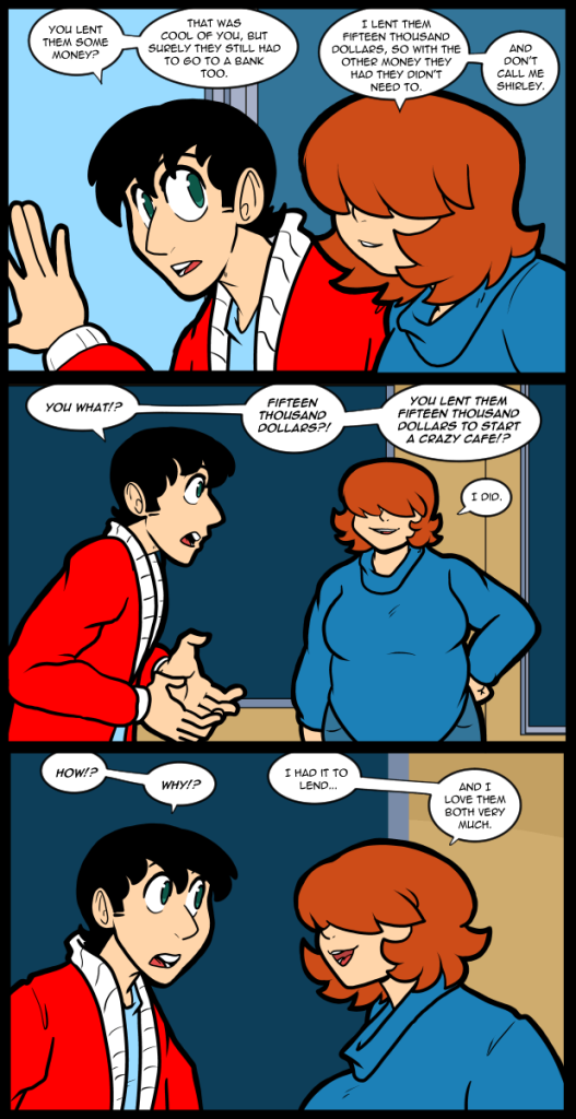 This page started a discussion in the editor’s chat about the cost to start a business. My original number for Alex’s loan was 10K, which I thought would be enough to cover nearly all the major purchases and whatnot, based on my experiences with starting businesses. My family was regularly starting businesses with no money. Apparently, in some places, it costs upwards of 70K just to get the ball rolling. At the time the comic takes place that was something like 30K. So I was trying to figure out how the hell people were starting with nothing out in Kansas in the early 2000nds. My mother is the only person still alive to ask and she’s busy right now, so I’ll have to get back to you on that. My answer to the issue was to set Alex’s contribution to 15K and hand wave the rest away with undisclosed contributions from other sources. In my experience at least people find ways to get things done. From a story perspective it really only matters that Alex is willing to go all in for her friends to take a shot at their dreams. I’m still left with a lot of questions about how my family may secretly be really good at business and I just never realized it.