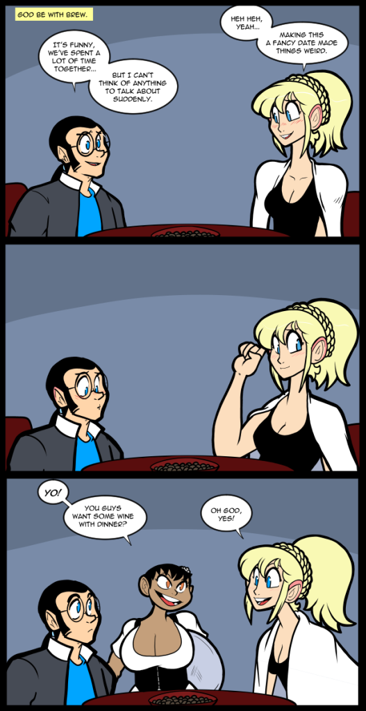 It is my opinion that, over time, in general, alcohol improves nothing, but pretending like it doesn’t exist is foolish. For something like this I have to write via observation as I have never been drunk. My guess is that it is not dissimilar to being overmedicated, which I have experienced. I’ve been around it most of my life and I dislike drunkenness in other strongly. But, as I said, it is a reality. Ed is a bit awkward, Nina is letting her hopes make the evening more intense than it normally would be and wants a quick solution. I think I can forgive her for that.