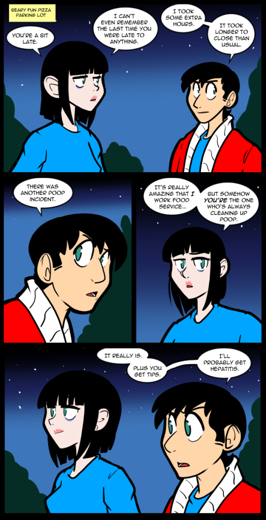 It’s frankly amazing I never got any diseases considering how much human feces I cleaned up in retail. I’ve also known a lot of people who worked food service, but they never really had horror stories. Well, not about poop anyway. A lot of them had problems with drug addicts ODing in the restrooms. I’m not sure what thing I would enjoy less. I never had to deal with an overdose situation. Generally I would tend to think of death as a mercy for someone with that kind of an addiction, but at the same time you never know who might have it in them to turn things around if given help. At this point it’s probably never going to be an issue for me, so I don’t think I’m going to give it much more thought either way.