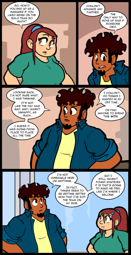 I know I should probably focus on a couple of characters, a couple of story threads, and write the way you’re supposed to. I should do things the way everyone else does so that people won’t write essays about how I ramble around and generally suck at webcomics, but I can’t. I’m too interested in this little world I made and the people who populate it. I want to write arcs for everyone and if I had infinite time and energy I would. I’d write for a thousand thousand years because I’m invested in my world. If nothing else I think that’s what ultimately salvages what I make day to day. You can tell when a creator checks out. Meanwhile I’m over here thinking about what I would write about Neil if I had time. I bet most of you don’t even remember who he is. I won’t say so that the most dedicated can dunk on everyone else by knowing. That should be fun for at least one of you. I could probably write an entire comic just about Jessica and Professor Keene. In fact, I would if I could, but even I know I have to reign myself in at least a little bit. I don’t have infinite time and I do feel at least some need to give lip service to sticking with the main cast. Of course I keep slowly expanding the main cast, but in fairness I do have a thing for expansion.