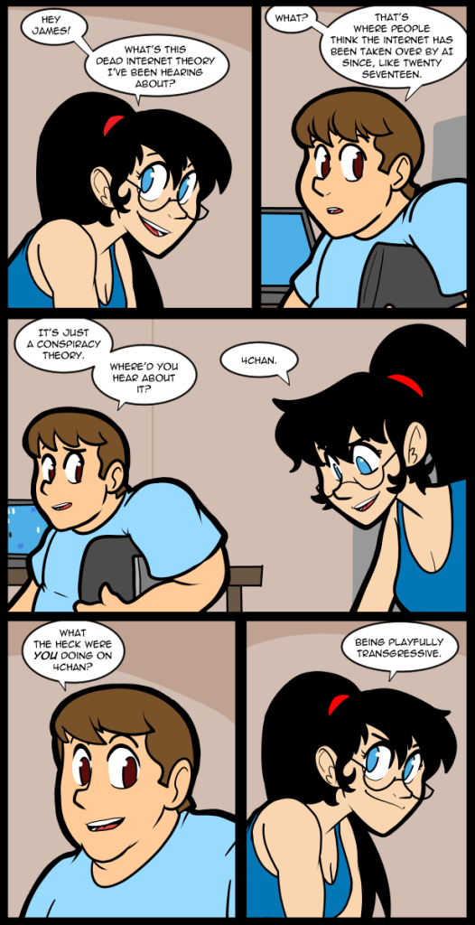 The internet at large may be run by AI, but my comic is not. This being the case please consider supporting my efforts via the services listed above. It’s still a ways off before I can give creation of this comic over to our machine overlords. So I need food and entertainment.