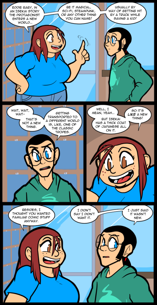 Whatever, I dunno. All I know is that Japan has a comics culture that’s much more like America’s was before the censors fucked it all up way back in the day. You can read all kinds of slice of life junk & it doesn’t have to be shoe horned into your superhero books because the American industry won’t take the time to actually build the culture. No, you have to go to webcomics for that stuff, where the creators toil for scraps. Although really everybody in a creative job at the actually ground level has to work for scraps in hopes that Hollywod will come and steal their IP for a handful beans.