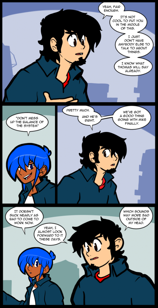 Jo is doing an impression of Thomas in panel 2, in case it wasn’t obvious. For the record, she matches his cadence perfectly, although not his actual vocal pitch. I think it says somethinbg about him that his friends think they know exactly what he would say, if not exactly how he might say it. Although there is always a chance that he would err on the side of romance. He’s been known to break a rule from time to time. Even his own.