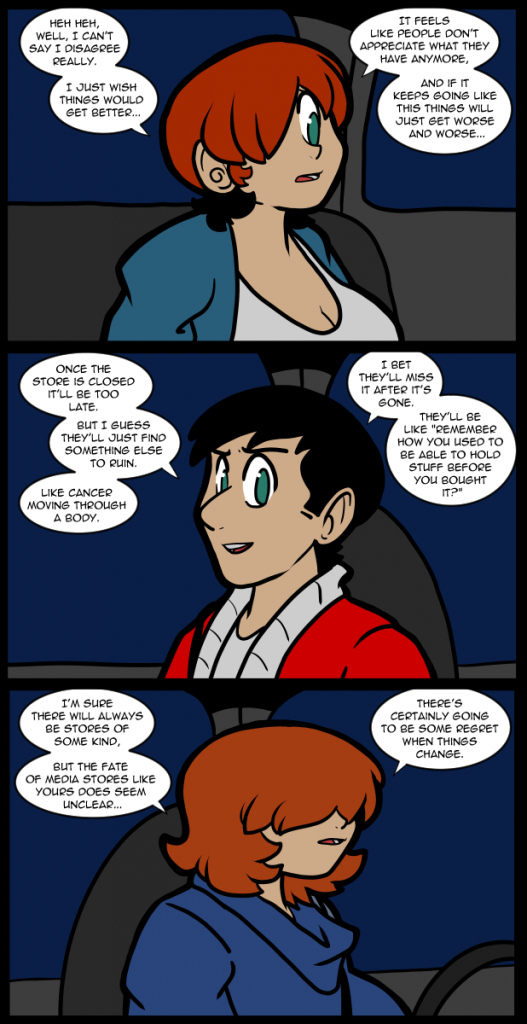 I miss stores. I miss malls. I’m only just now getting to a point in my life where I’m successful enough to have enjoyed them the way I imagined I would eventually. Now I can potentially go into a store and buy a thing if I see a thing I like, but now there are no stores for that. I know some larger places still have media store, or bookstores, but out here it’s just walmart or dollar stores, and the occasional Gamestop. It’s not that I don’t like the convenience of Amazon, or online retail in general. It was just fun to go out and forage. Most places have very limited selections of media if they have any at all. Having been burned by the move to digital media I am wary of letting physical slip away.