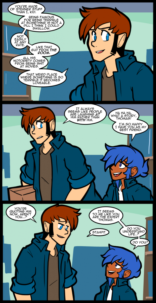 I said this on twitter but let me expand on it: as a character Jo presents unique problems. Since she loves basically all movies ans can recite many of them line for line it sometimes requires me to research things I ultimately don’t care about or have even actively avoided in some case. The Room is one of those things. I know of it, I’m passing familiar with the memes, but I’ve never watched the whole thing. Much like plan 9 from outer space. I understamnd the cultural impact, but don’t care to see the work itself. In order to write this part I had to see more of it that I ever intended to but couldn’t think of a more perfect example of the point Thomas wanted to make. Of course Jo needed to respond in a way that fits her love of things like The Room. All that said, I can see why people love it. There is a childlike earnestness to the work that makes it seem like it was created as a very pure expression of the creator’s desire to make a meaningful movie. It’s like a little kid showing you their drawing of a horse that looks like a shit on a field of green scribbles. It’s not very well executed, but you can see the beauty of the child in the garbage they made.