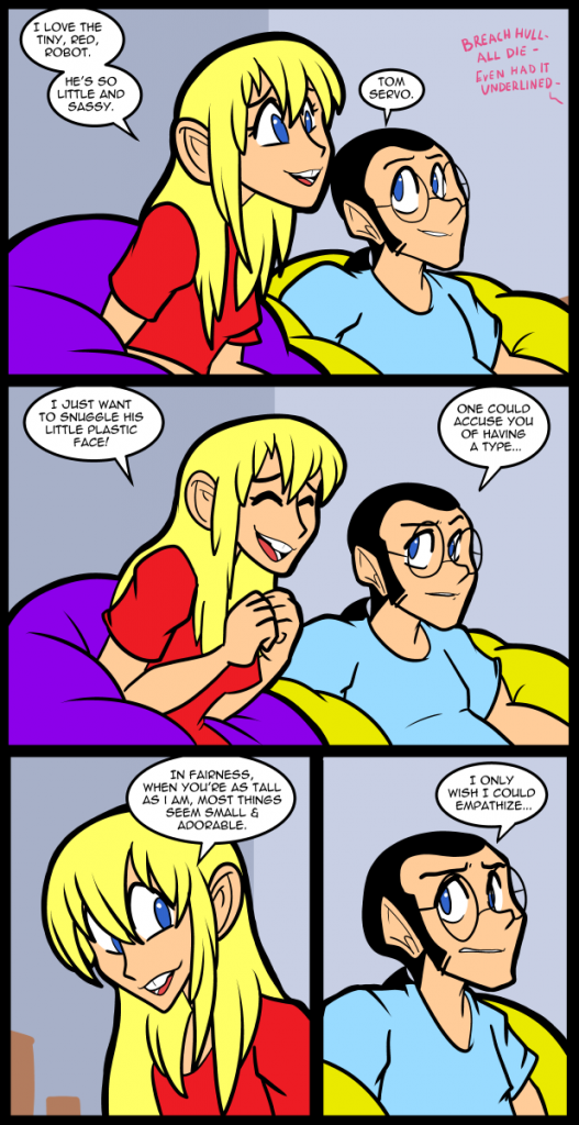 Those of you with keen memories may recognize the beanbags from much earlier in the comic. Not sure if that’s the first time they were featured, but I’ve always drawn them as the main furnishings of Jess and Edward’s apartment. I actually had a beanbag like the yellow one at one point. If memory serves a girl I was dating was going to throw it out and I took it because it was still good. No idea what happened to it, but I know that my friend Chris fell asleep on it a bunch of times. While my cat, which he was allergic to, climbed up and sat on him. So he would go home with a runny nose and watery eyes. In spite of this he loved that cat.