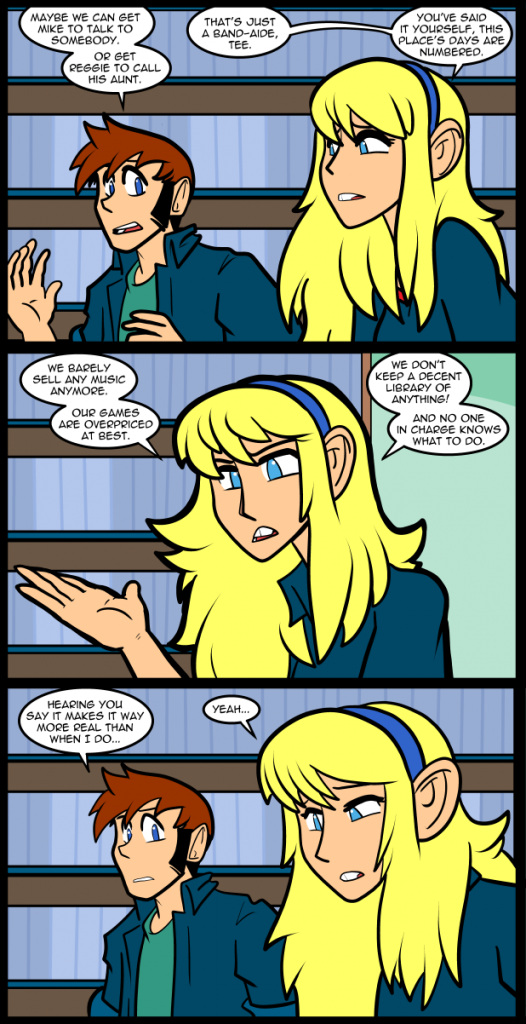 When Thomas tells everyone the sky is falling he’s kind of doing it to prepare everyone for the worst, but also hoping that everyone else will tell him he’s wrong. Like the tenth Doctor, he doesn’t want to go. Even though he’s not as happy as he wants to be he’s safe in his comfortable world, which is as good as most people will ever get. To lose Nina would be truly heartbreaking for him. They have been through the most together. Before everyone else they were the two new hires in a store that was very adversarial to its employees, but together they survived. They are the heart and soul of the team. The pillars that everything else is built on. Losing either of them would throw the entire system into chaos. I lived through that sort of thing so many times when I was in retail until, eventually, I was one of the pillars. When I left I watched my former section deteriorate into a nearly unrecognizable mess. Even though it wasn’t mine anymore it was sad to watch unfamiliar faces wash in and out of my old position. When I left Hastings the there were still a few people that I considered pillars of the store left behind, but they all eventually fell away too. Some in ways more sad than others. The only one left when the announcement came that the stores were closing was the book manager. She was there before I came along and stayed for the entire rest of the store’s time. We were never friends the way Thomas and Nina are, but I very much valued the fact that she was dependable. She took books seriously. Maybe even too seriously for the store she was in, but her section was almost always the best kept in the entire store. Whenever I came back in she would always tell me everything that happened since I left. I heard about all the stuff that was going on through her up until the last couple of years. Since I got sick I couldn’t get out that way anymore, so I don’t know the final chapters of the saga. I should try and look her up so I can find out how everything finally ended.