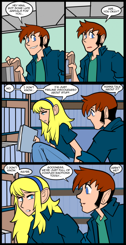 I almost went way more dramatic with this, but pulled it back because it seemed like too much when I drew it out. I have to be careful sometimes because my mood will infect the tone of the comic. It was a pretty dark weekend and when I was doing this page I wasn’t feeling very good about anything. I’ve gotten pretty good about being able to shift into work mode when I need to, but sometimes I have to be careful. This part sets up a whole string of events, and is intertwined with stuff already in the process of happening, so I don’t want to fuck it up.