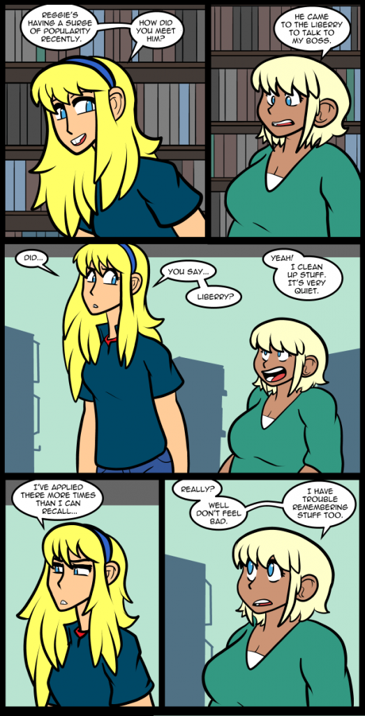 I’m not exactly sure what rules there are for hiring people at a private library. I know they must be available someplace, but I didn’t feel like researching them because trying to research laws is always bullshit. You get 75% of hits that are just armchair lawyers guessing, and the rest the sort of random garbage people puke up on yahoo answers. I’m not even sure if a private library even has to follow any rules for hiring people. In any case, the one Maddison works at accepts applications at the very least from the general public. Which probably filled Nina with false hope for all these years. It’s even possible that she, like most people would, assumed that it’s a public library funded by the city. It is not, as Alex explains in the section this link navigates to. Maddison pretty clearly got employed because she’s Alex’s friend and she’s not super good at doing anything that requires a lot of focus, or skill. At least not that Alex would have noticed since she values things other than what Maddison excels at. Nina would, almost definitely, be an asset to the library, but the fact of the matter is how many people does it really take to maintain what amounts to a house full of books? I’ve never seen a library with more than 4 obviously active librarians. I haven’t even been in a library since the 90s that I can remember, so I have no idea if this has decreased or not. The three known employees of the Marbleton library are Alex, her mother, and Maddison. I’m not sure how many others there would be. I know at least a few of you are librarians, so feel free to inform me if you have the time and inclination.
