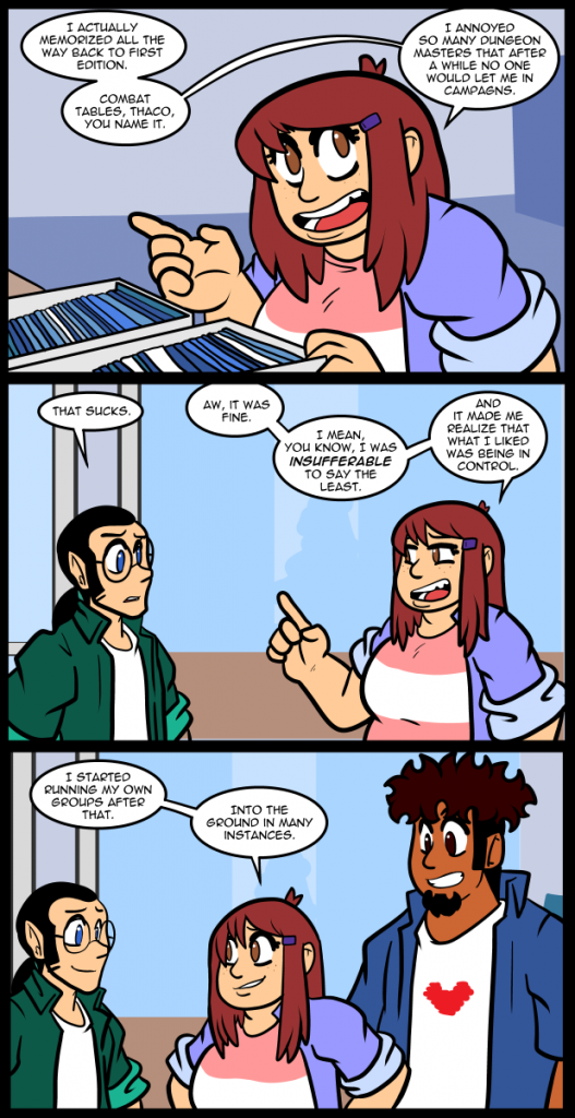 Patricia is not the sort to ruminate over her past mistakes. It’s all just part of the adventure. I’ve always lamented that I was never able to play much D&D. It seems like something that I would have enjoyed a lot more if I’d been able to get further in to it. The few games I did play were a lot of fun, even though we dicked around a lot and didn’t have enough people to really make it seem like a full game to me. Five seems like the ideal number in my mind. Four players and a DM. Maybe that’s from reading Knights Of The Dinner Table. Right now I can barely find the time to do the things I need to do, so contemplating finding people to play with is ridiculous.