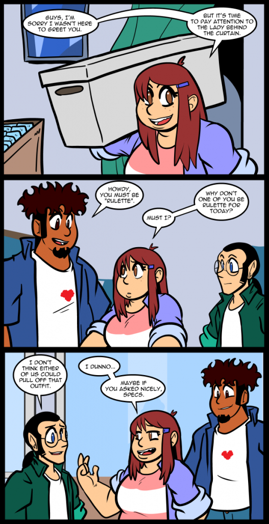 Before drawing this page I’d never really though about what colors to use for Rulette. She existed as one black and white sketch from a decade ago, and a nebulous idea of what the character was supposed to be like. I wish I could say I planned her out in intricate detail, like I did with a lot of the cast, but I didn’t. She’s less of a seat of my pants character than Kayla, but not by much, at least visually. She was also going to be a lot younger originally. Her story was going to be the evolution of a player into a dungeon master, but I finally accepted that I was never going to get to tell that story. Throwing away perfectly good character ideas in favor of what I’m capable of producing seems like such a waste. I’ve got all these ideas with no way to act on them. It’s wildly frustrating. Alex, Rulette, and Reggie are all responses to not being able to tell the stories I want to tell the way I wanted to. Mixing their ideas in with Between Failures has made this story better, but some of the original vision has been sacrificed in every case. Maybe someday I can circle back to Rulette’s backstory.
