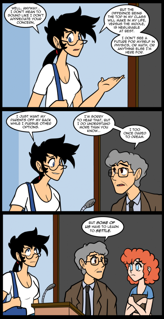 Oh Kayla, the world needs ditch diggers too, and professors who never really live their dreams. It’s pretty surprising how many of you really liked Kayla. I seriously spent no time creating her. Which might be why she looks like a discount Pinkie Pie. If a character is going to appear a lot I try not to design them with a lot of intricate details. That’s why Carol and Nina don’t have freckles, for example. I sometimes draw them that way in outside art, but in comic it takes to much time. I try to keep designs as streamlined as possible. It’s way easier to do that when you have to keep to a schedule. If you update whenever it’s not such a big deal. The regularity of updates is very important for monetization online though. so the easier you make the art in general the better.