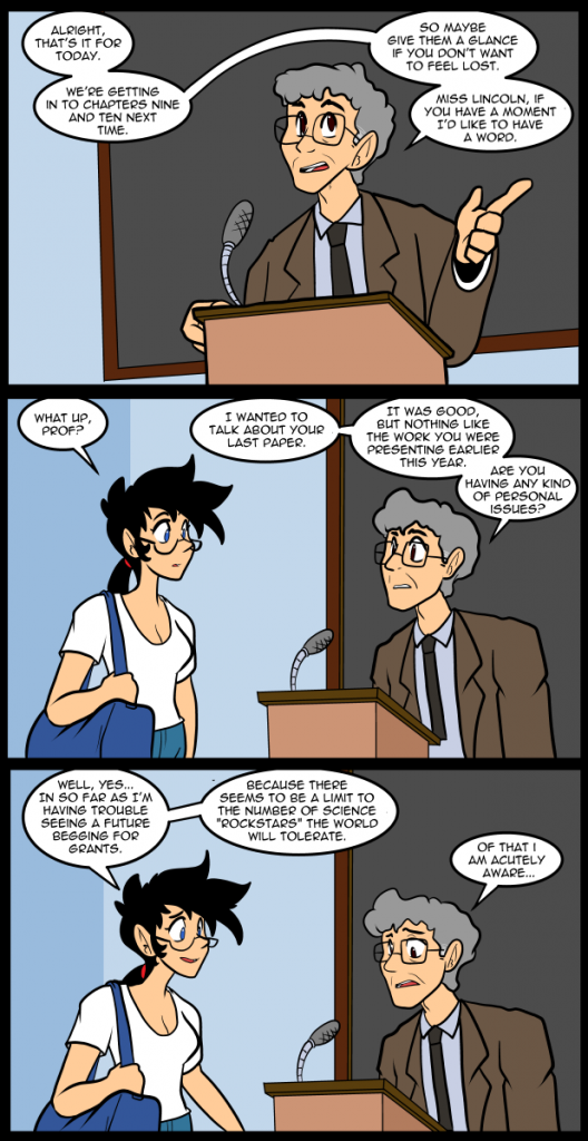 I almost scrapped the furry arc because I didn’t think I could convincingly portray a library. Honestly I don’t think I did, but that story needed to happen to set up other things and I couldn’t figure out a way to work it in to something else. There are so many settings I want to use but I always have to make due with what I have and can sort of make work. I’ve studied perspective and all that. Watched more tutorials than any person should be subjected to, but still never managed to come away with much. It always looks weird when I try to draw complex scenes. I’m just seeing what I can get away with here because I want Jess to have her backstory. She seems like she just bounces in and out of everyone’s lives like a magical creature when, in reality, she has an entire life of her own that she doesn’t really share with anyone. Even her brother wonders how she finds time to go to her classes. Jess is one of those people who always seem to have energy. Like she’s powered by something beyond what other people are. I know a few people like that and have never understood how they function. Even when I was young, and in relatively good health, I was always sad, or tired, or angry, and couldn’t focus, or get things done the way I wanted. Everything was a struggle and people like Jess made it look like life was so easy and the one with the problem was me. Honestly I think there’s more truth to that than I fully grasp. Some people are just better at life and that’s the way of things.