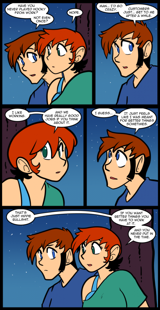 These two are not opposites. They have traits that overlap, but at the same time they approach life in different ways. Not totally in opposition, but enough that it can cause tension. Thomas has a notion in his head that he is somehow destined to be great in some way. A notion that he may not truly believe in, but it colors his outlook. His default belief is that he is better than other people for reasons. In this moment Carol’s worldview is in opposition to that magical line of thinking. For her greatness is something you work towards. You might have abilities that make it more likely that you will achieve greatness, but at the end of the day you still have to put the time in. She is correct in this belief. Being told you are special your whole life doesn’t make it so. You have to live up to it. It shouldn’t be looked at as a given, but rather a goal. In Thomas’s mind it’s a given. It’s peppered throughout his dialogue. He is apart, he is above, with very little evidence to back it up. I think it’s clear that he has what it takes to be great excepting for the crucial element of drive. It’s much easier to be a big fish in a small pond and he’s fearful, and lazy, and arrogant. Though it’s harder to see in him he’s very similar to Reggie in many ways. He’s just more charming. He empathizes more easily. His motivation is for the general well being of the people he knows, but his own well being is paramount. Keeping things the way he likes them overrides all other aspects of his plans. Each person has a calculated value and a frank estimation of their skills. Which is why he is willing to sacrifice John in favor of Carol when it comes to the promotion to assistant manager. Carol is too important to him to risk losing. Even though John is more than just a work acquaintance he isn’t dependent upon him the way he is with Carol. Even if they hadn’t started dating he would’ve tried for the outcome he wanted because having her there as a goal gave him the motivation to face the world. It is not a healthy way to live. Pinning your ego to something outside of your control is generally a bad idea, but people do it all the time. Everybody knows someone who gets all destroyed when their sports team fails at the big… hoop throwing. It can throw off their life for days. Thomas pinned his happiness to a person. Which is basically what love is, but not quite.