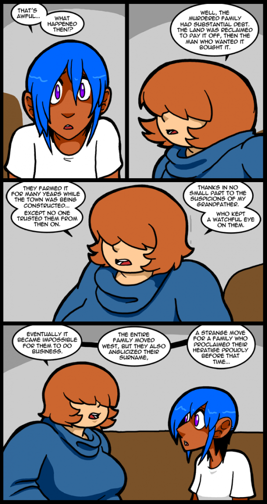 I forgot to mention on the last page that I researched common burial practices of the time period to make sure the story was plausible. That led me to the flu pandemic as a way to bolster Alex’s theories. The event was absolutely devastating. Still, burning a body is generally considered abhorrent for a multitude of reasons, so it was never widely done. Suspicion would have been warranted in this situation. Of course without anyone to enforce the rules around the unscrupulous will take advantage of the less fortunate. Hell, even with a complex system of laws the unscrupulous run rampant. Just imagine what it would be like without that. Well, you don’t have to. All you need to do is read a history book about the settling of America. That’s what happens. Eventually some kind of order will be imposed. Even tyrants hate disorder. In order to feel safe from unsavory elements humans will always set up some kind of system of laws. Of course the problem can then arise of too much law. Sometimes in our efforts to be thorough we go a bit far. (In addition to being racist and a host of other reasons…) Then the law gets out of control. As we see time and again in life balance is what we should strive for.