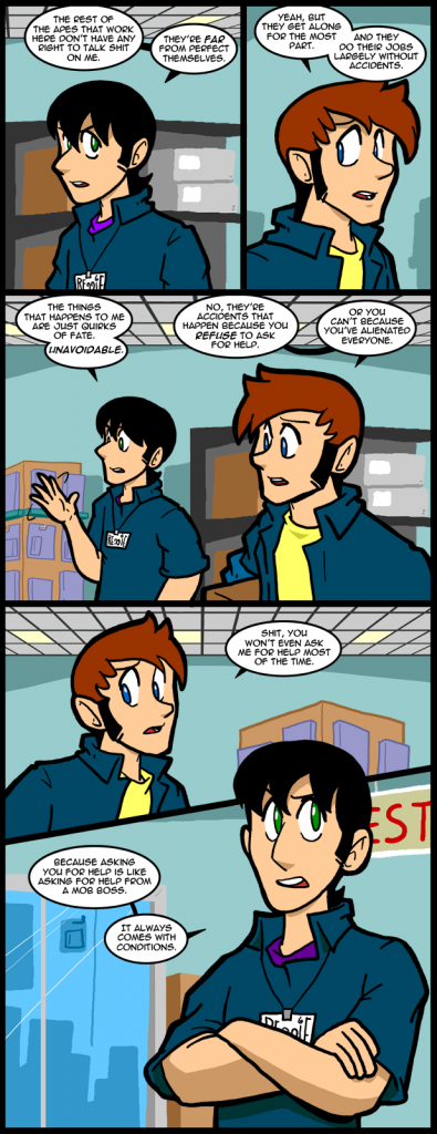 Seeing as today starts a new month, and it looks as though my patreon total is going to stay above $400, I owe said patrons another chapter of my story. I’ll write it up and post it there first. After a bit I’ll post it here for everyone. I hate to keep it from other readers, but it’s only fair that there be some benefit to being a patron… Apart from the comic anyway. Regardless everyone gets to see it eventually, so whatever. Seeing as there is also at least one person carrying more of the burden than everyone else I need to come up with some kind of reward. I guess I need one for other ranges of patrons too. I’m thinking of doing a limited run poster of Brooksie to send to patrons who give X amount of money. Then making a new one every so often that they will get as well. I’m not sure what the cost of that would be, so I’ll have to look in to it. It doesn’t make any sense to spend all the money on presents when the idea of it is to improve the comic in the first place. I have too much of a headache right now to think any harder about this right now anyway…