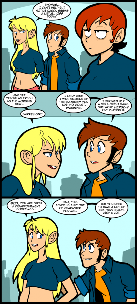 Some people have theorized that the reason Nina shows her belly off so much is that she has trouble finding shirts that fit. It’s never been brought up in the story but that’s not the reason. She’s willfully breaking the rules because she likes open clothing AND her tummy is pretty spectacular. She has sense enough to know when not to do this, but it is still a risk which she gets a thrill from. I’ve always thought of it as a holdover from her days as a very vain cheerleader. In spite of how wise she seems sometimes she still has a streak of immaturity. Part of the reason she hasn’t had anyone in so long is that vain refusal to settle for anyone but who she likes best. She still has a tendency to value the superficial in a relationship. Her complex relationship with Thomas probably doesn’t help anything either. There was likely some hesitation to let go of that chance with each other that held them both back at one point or another. Use it or lose it, as they say. Sometimes you need to make a decision before life makes it for you.