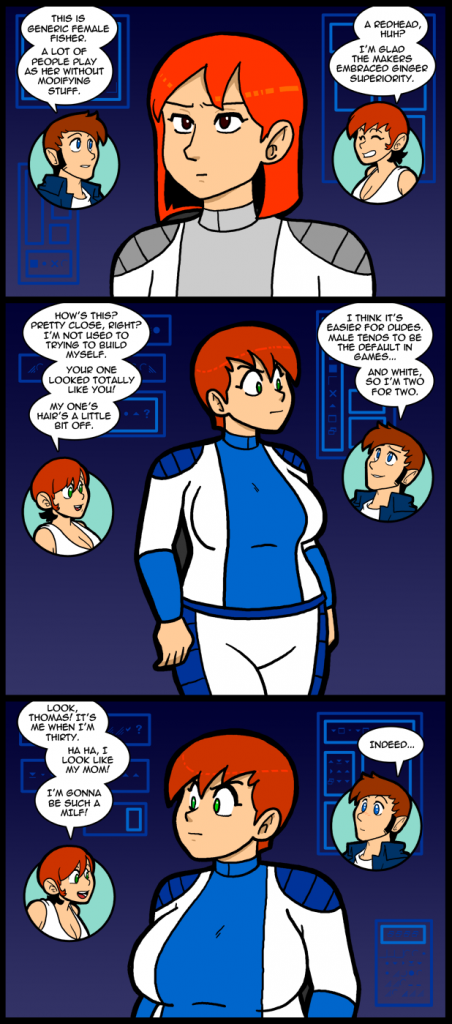 I’ve never actually made a female character in Mass Effect. I’ve played that way in Dragon Age and KOTOR, but never even bothered to try in ME. So, I don’t really know what the limits of character creation are. I’m guessing, based on my recollections, that you can’t have a tubby adventurer wheezing through space. This scene is actually more like what you can do in Saints Row 2 (I think) which is pretty much anything. (I basically made a character just to test the limits, played for ten minutes, and quit because I didn’t like the gameplay.) In actuality even regular Carol would be straining the limits of character creation in most games. Middle age Carol would go so far beyond those limits you couldn’t even get close. Most games just try to scale up the generic breast, which is typically not how breasts grow, and is really off putting. Leaving them however they start is about as good as it’s going to get, so a lot of the time I don’t bother with customizing a character at all. My Shepard is straight from the tin. This is partially because he’s the face of the game in the game media. In KOTOR they never show the player character in promotional stuff, so I didn’t go in with preconceived notions. That made it easier to build a character however I wanted. Basically by making generic Shepard iconic it discouraged me from experimenting.