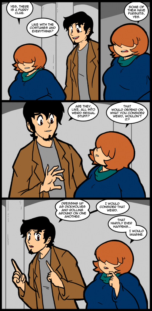 I certainly don’t feel like part of a furry community, but I don’t feel like part of this “webcomics community” I often hear about either. I’m pretty clearly making a comic, so maybe feeling alone is something in me. I only know one furry very well, but he’s about the most open person I’ve ever met about practically everything. He’s also helped me a lot over the years and given me work occasionally. In my head though he’s just a friend I have who likes a thing that has all this baggage associated with it.