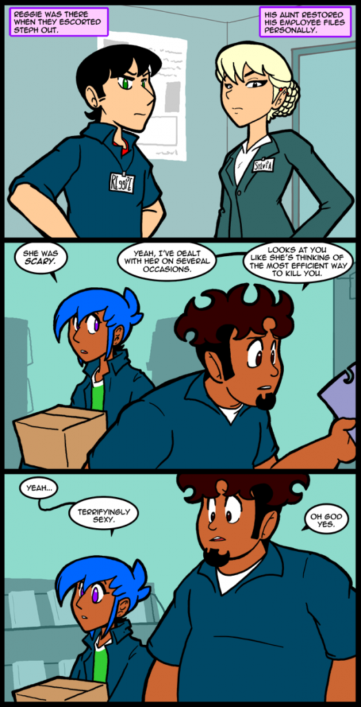 Honestly there’s no need to show Sylvia (I accidentally wrote Reggie’s sister’s name on the nametag at first. Victoria is his eldest sister, btw.) other than as a gift to long suffering readers. You’ve heard tales of her and had no face to put with them. By her appearance you can clearly tell that there is a lot more to her story than meets the eye. That will likely be touched on from time to time as the story progresses. There are other inferences to be made by this image, but I’ll let you come to them rather than just spell them out.