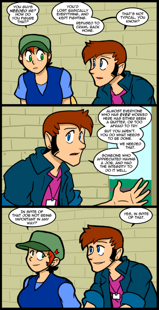 What Thomas is saying here is actually pretty important. The kind of workplace integrity that he sees in Carol is actually becoming very rare. It’s something he recognizes as a quality he lacks. On other occasions he’s even argued against it because the world is rarely ever so clean cut as to make any one position constantly correct. In my opinion it’s a systematic failure. As companies begin to value their employees less and less said employees, in turn, begin to value their jobs less and less. Even in our currently crippled job market very few people seem to actually value their employment. Of course that’s based on what I’ve seen. Maybe there are places in the country where things are getting better. I wouldn’t know. The long and short of it all is that if a business does right by its employees they will do right by the business, for the most part. Or it was that way at one point. Since the system has been breaking down people have increasingly been of the mindset that they need to screw over the company they work for before the reverse happens. I can’t say I don’t see the logic in that either, but it’s a cycle of deterioration. Until one side decides to make a stand against the deterioration of that social contract things will keep getting worse. It’s not as simple as all that because you have to take into account a lot of outside factors, but this is the simplified state of things as I see it.