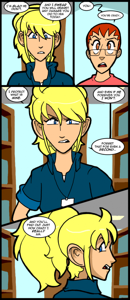 These debates about who screwed who are pretty interesting. Even my even handed viewpoint came under attack at one point. XD I have to say that, as far as holding a grudge after a breakup goes, the time you hold on to those bad feelings correlate to how much you loved the person and how much it hurt to have them gone. Some people can just give people up and move on, but it’s been my experience that even those kinds of people can have an attitude shift when they lose a mate that they thought of as “the one”. So, maybe attachment is the deciding factor for the statute of limitations on relationship stuff? I dunno, I haven’t thought the argument out, I’m just letting the thoughts spill out. In any case the interaction between Dawn and Nina is not one that is going to foster understanding. Nina made her mind up a long time ago and was perfectly willing to let it all slide for the sake of keeping the peace until Dawn found her hot button. She kind of screws the cap down on being scary today. A Nina is clearly not a creature that should be stirred to action…