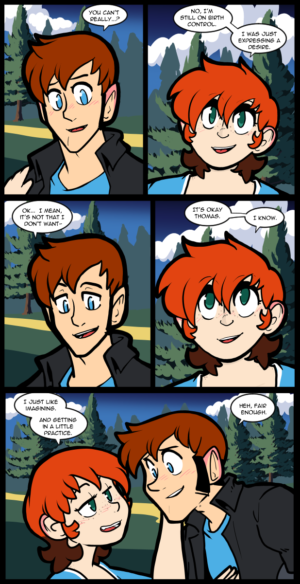 I think that logically Thomas would know that Carol isn’t going to spring having a random kid on him like that. In the moment however her sincerity made him question things. On some level Thomas doesn’t believe that anyone would love him enough to commit to the degree that Carol has. That’s just the irrational part of his mind that traps him in his normal mode of thinking. At the same time it’s not like things can’t change and she could get tired of him. In his head he’s always running scenarios, and future possibilities, based more on his insecurity that reality. His success rate comes from understanding human nature and unintentionally pushing things to go the way he expects in a self sabotaging way. I’m not sure how much of that part of him comes through in the actual pages because to me it seems very obvious, but I live in that kind of a mind all the time. To someone else I’m not sure if it actually reads like that. I’ve never used inner monologue very much because in order to correctly present what it’s like in Thomas’s head it would require so much relentless text. I’ve tried to present it in a subtle way via his words and actions. Of all the characters he’s done the most narration though and had the most inner thoughts presented. I’ve never fully opened that door though. Maybe sometime in the future I’ll let people peek in. I’m not exactly sure how to present it because rom my own experience it’s extremely off putting to others. One of the reasons I’ve never had to worry much about parasocial relationships with my own audience or stalking is because my personality is so relentless that the handful of people who have developed those tendencies start pumping the brakes really hard once they get a taste of pure me, which is of course what Thomas’s personality is founded on. He’s not really an idealized version of myself because he is extremely flawed, but he’s still so much more endurable than I actually am.