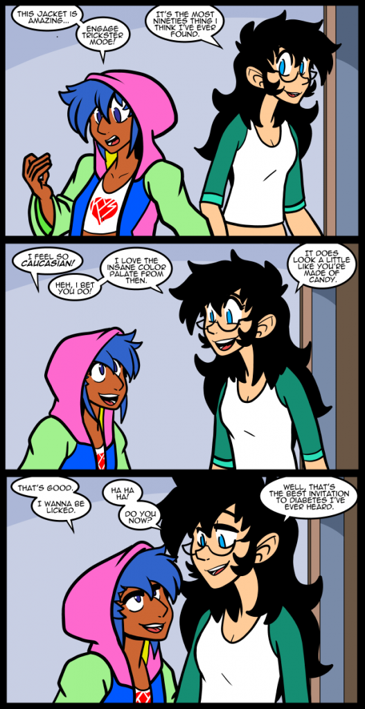 In case what Jo is saying on this page sounds like gibberish know then that she is referencing Homestuck. In fact she’s referencing something that isn’t even in Homestuck anymore. The line “I feel so Caucasian!” was changed to “I feel Peachy!” because Homestuck fans are very precious about skin tone. Since Jess & Jo… Continue reading 1823 How Many Licks?