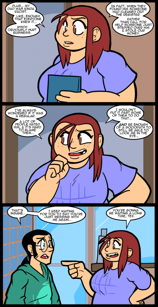Patreon Comic Vote Reddit Wiki I think it would be safe to say that Patricia is a little broken from the various tragic things she’s gone through. To the point where she’s numb to the tragic on some level. That’s her coping mechanism. A sort of happy nihilism that makes it possible for her to… Continue reading 1899 Problematic.