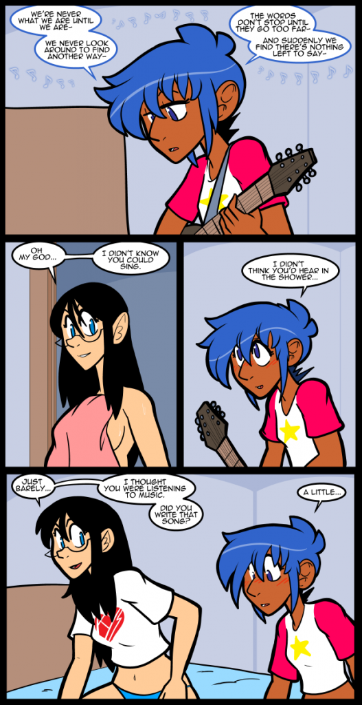 Patreon Comic Vote Reddit Wiki Discord I am, by no means, a songwriter. That first panel is about as much as I could muster without taking a ridiculous amount of time. One thing I do know about songwiting, however, is that lyrics only have to SEEM meaningful. Most song lyrics don’t mean anything if you… Continue reading 1906 Songstress.