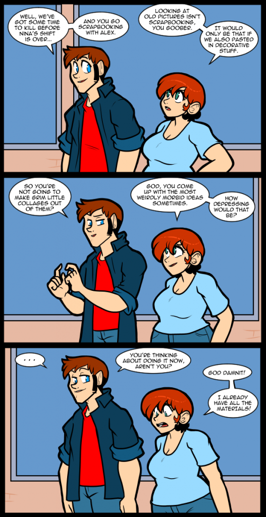 Patreon Subscribestar Comic Vote Reddit Wiki Holiday List Twitter @betweenfailures Contact me for a Discord invite. One of the things that I’ve always found interesting is how where you cut off a character in a frame changes how your brain sees them. Carol in this image has her normal bust size. I measured it versus… Continue reading 2256 Scrapbooking Of The Dead.