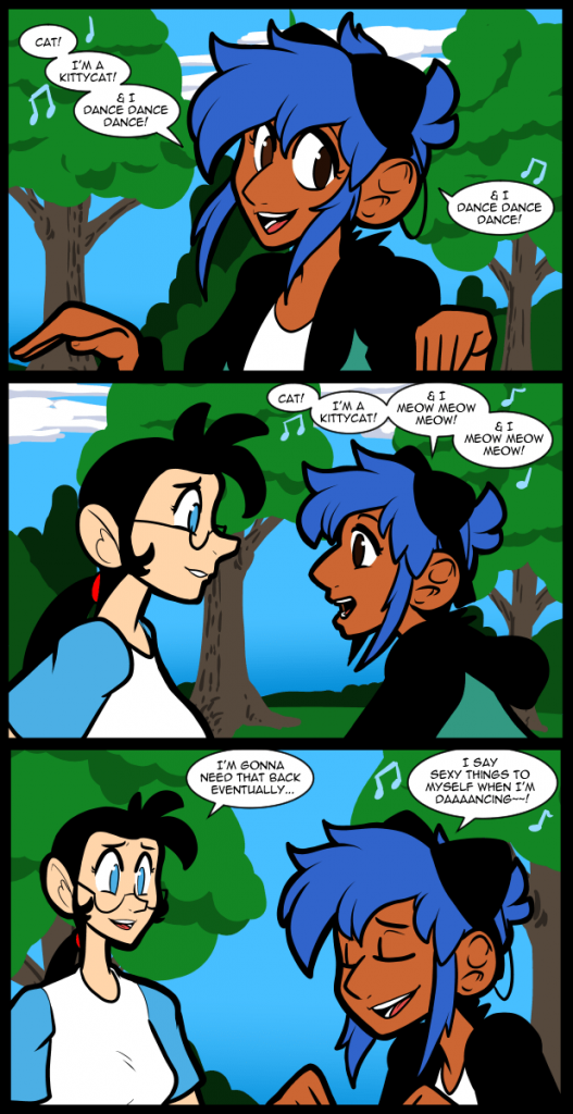 Patreon Subscribestar Comic Vote Reddit Wiki Holiday List Twitter @betweenfailures Contact me for a Discord invite. Hopefully it is clear that Brooksie has Jessica’s bra on her head, which she thinks makes her look like she has cat ears. The song she’s singing is an old meme called The Kitty Cat Dance. I don’t usually… Continue reading 2265 A Kitty Cat.