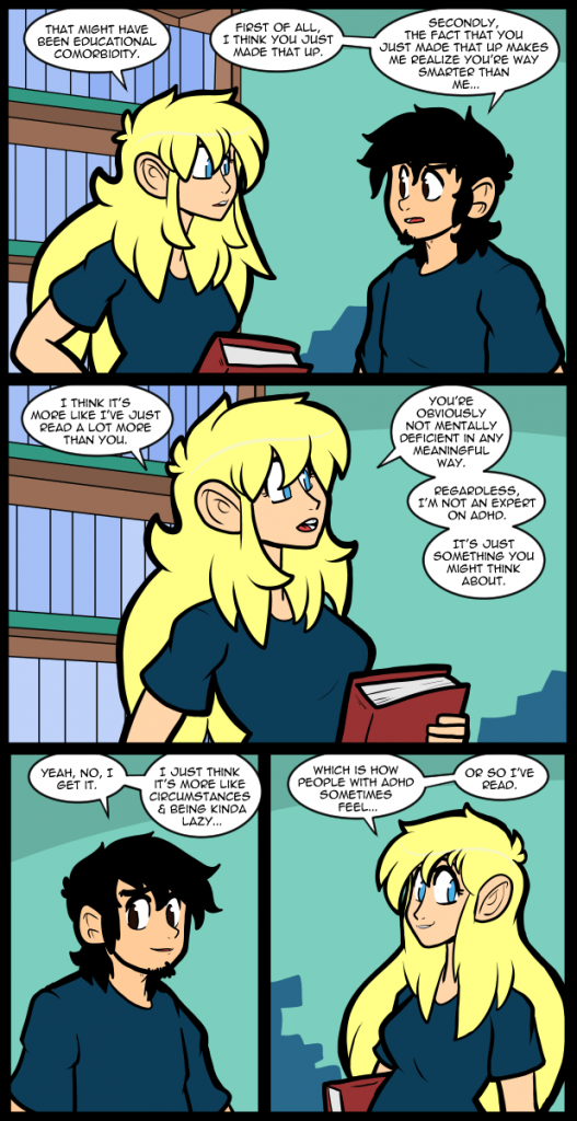 Patreon Subscribestar Comic Vote Reddit Wiki Holiday List Twitter @betweenfailures Contact me for a Discord invite. I think on some level John doesn’t want to know for sure if his academic struggles are simply laziness or a condition. Not knowing something like that leaves room to shift blame in your head as it suits the… Continue reading 2278 It Might Be A Thing.