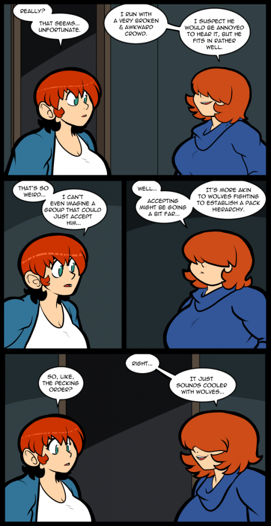 Patreon Subscribestar Comic Vote Reddit Wiki Holiday List Twitter @betweenfailures Contact me for a Discord invite. Inside of you is a wolf. Next to that wolf is two other wolves. They are all howling at the moon. It’s pretty crowded & loud inside you I expect. Maybe let the wolves out sometimes. They might start… Continue reading 2323 Birdpack.