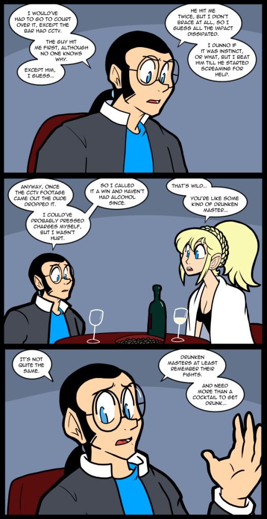Patreon Subscribestar Comic Vote Reddit Wiki Presents List Shirts & such. Man, this week seemed to go by weirdly fast. My sleep schedule was all out of whack though. I guess that’s why. Anyway, long, long, ago, in an early comic idea where Ed was the main character, he also had this low tolerance for… Continue reading 2623 Drunken Fist.