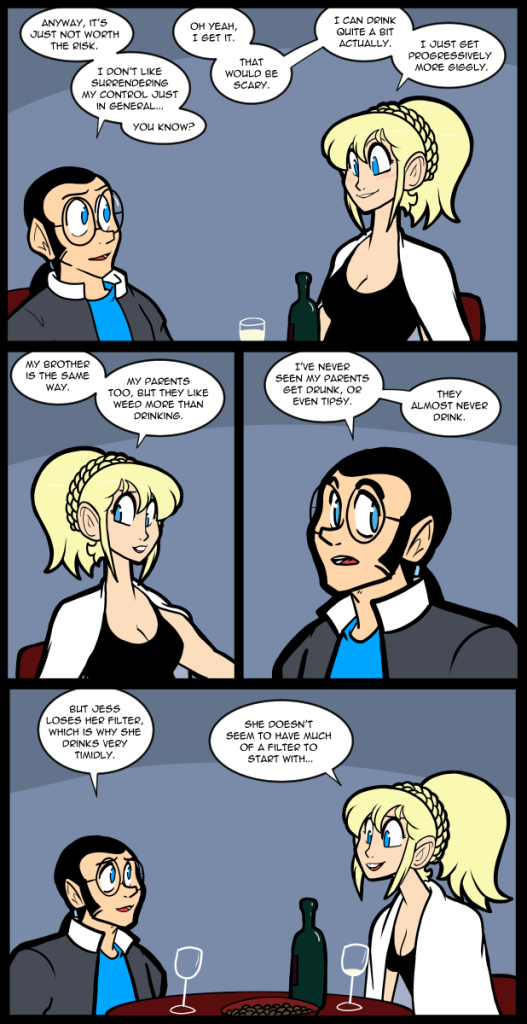 Patreon Subscribestar Comic Vote Reddit Wiki Presents List Shirts & such. I guess, since this is going up later than I would like, I won’t waste your time with a long blog. Support links up top as always. I hope things are going well for you, in spite of all the things in the world… Continue reading 2624 In Vino Veritas.