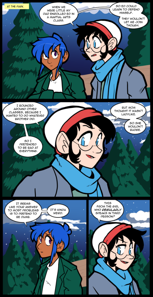 Patreon Subscribestar Comic Vote Reddit Wiki Presents List Shirts & such. Ko-Fi. Since I’m so close to being done I’m posting this page technically unfinished. If you check back later I will have changed the art a bit to fix the problems that I can’t abide long term. This will suffice to move the story… Continue reading 2658 She’s Got Her There.