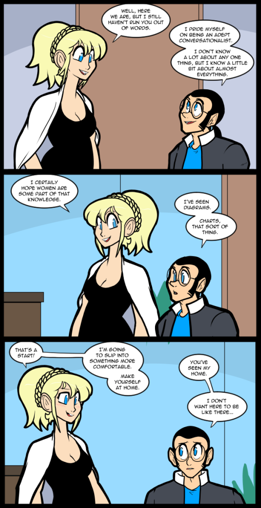 Patreon Subscribestar Comic Vote Reddit Wiki Presents List Shirts & such. Ko-Fi. I was awake when I usually sleep today waiting for a package that maybe had to be signed for. Luckily it didn’t because I fell asleep about 5 minutes before it got delivered and was awoken by the sound of the truck driving… Continue reading 2667 Here/There.