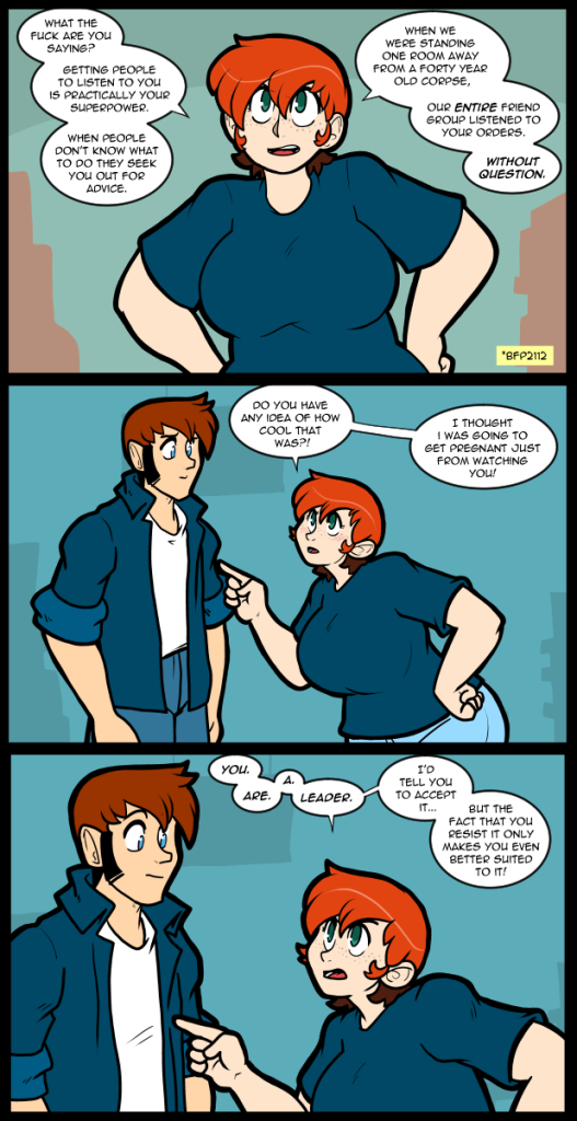 Patreon Subscribestar Comic Vote Reddit Wiki Presents List Shirts & such. Ko-Fi. It seems pretty rare for characters to actually express what it is about each other that gets them going. People can gather the vague things, like Thomas is funny, or Carol has big boobs, but there’s usually a lot of other unspoken stuff.… Continue reading 2680 Leader Of Mehn.