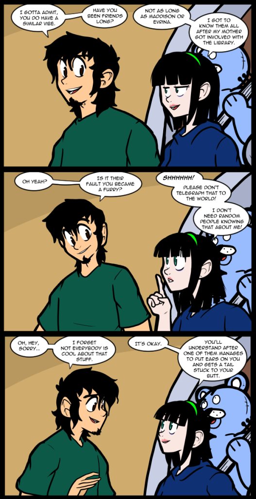 Patreon Subscribestar Comic Vote Reddit Wiki Presents List Shirts & such. Ko-Fi. I got a little behind today. My sleep schedule always shifts when I’m left alone for long periods of time so it has slid more to the morning, which is a time I generally don’t like being awake. I guess it’s not like… Continue reading 2940 Fur Stands Up.