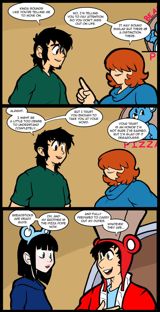 The romance options going on in this pizza place are too varied. I’ve never been the kind of person who gets embroiled in that kind of thing so it’s kind of strange to write it. I’m not particularly handsome, and hard put to tolerate a fool, so getting into any kind of situation with one person was rare. Anything past that was basically impossible. My characters, on the other hand, have a tendency to be very compatible with each other because most of them are very pleasant people at heart. They also tend to have their own kind of charisma that resonates with the others well. Maybe that’s just a function of the majority of them having a little too much of me mixed into them. Since I’m one of the only people who can get along with myself I guess that makes sense. There is always someone who doesn’t like whatever pairing you decide on when you write one. In the early years people were mad that Jo didn’t date John. Some people were really angry that she was bisexual and landed on her gay side with Jess. That eventually subsided, but it does come up every so often because a lot of people hate Jess. Ed and Jo were a pairing a lot of people liked at one time, and I could see it too. They get along well and all the other little things that make it seem like they could be a couple. I remember hearing those people being quite vexed over her choosing Jess. People didn’t really complain much about Ed and Nina, although there are people who strongly think Nina should be with Thomas. I can see why because Thomas and Nina have a very strong chemistry that really simmers when they talk about their shared past. The majority of people are in the camp that Carol and Thomas are a good match, which hinges very much on the scene where the comic changed to color. That said, there is a section of readers that hate Carol and want Thomas to be with Nina. I’ve heard all kinds of pairing suggestions. Since Mike is lonely all the unattached females get brought up. One former reader wanted Jo to date Mike in very strong terms. Maddison has been suggested, and Rulette, which both could work and make sense. Mike is not particularly picky when it comes to women, and I’ve tried to make that clear without him seeming like he’d settle for anyone. Bridgette has been suggested for him as well, and there’s not a lot to go on with her since she’s appeared so sparsely, but it’s a chance for romance and people like love stories.