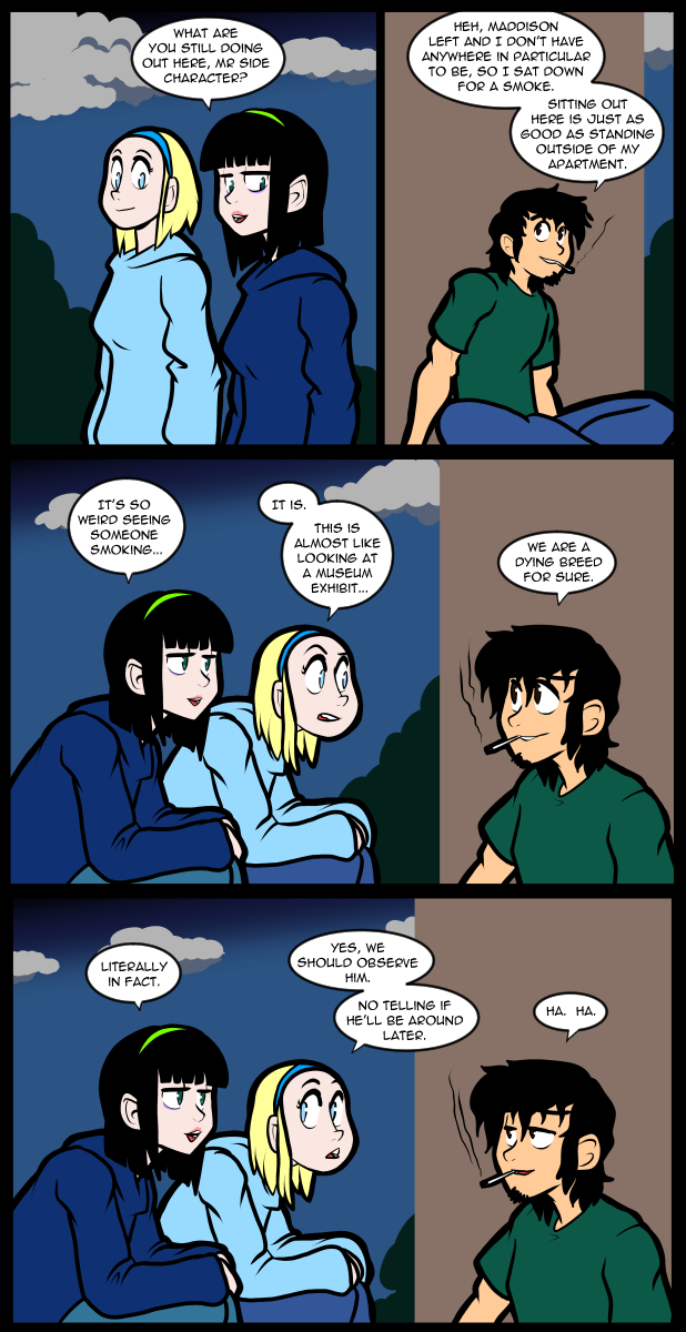 I was almost done with the page when the idea of Alex dragging Reggie away like Maddison had done before came to me. Originally she was just going to be holding his hand, but the idea of him getting manhandled again struck me as funny, along with his irritation about the entire affair. Really though, it’s not like he’s fighting all that hard to get away from a good time. It’s more like he would rather be the big tough man, which he categorically is not. Alex also wasn’t going to lick his face, but that idea came to me in the sketch as her being a little extra about the entire thing. Underneath the bangs Alex is actually quite a keen person. They are kind of a mask that she wears to mentally keep herself from being overly emotional in her everyday life. A person could infer that much if they noticed how much more animated she gets when the bangs go up. It’s always under the surface, waiting to be unleashed. It’s amusing that Reggie of all people is the one who dove in first, so to speak.